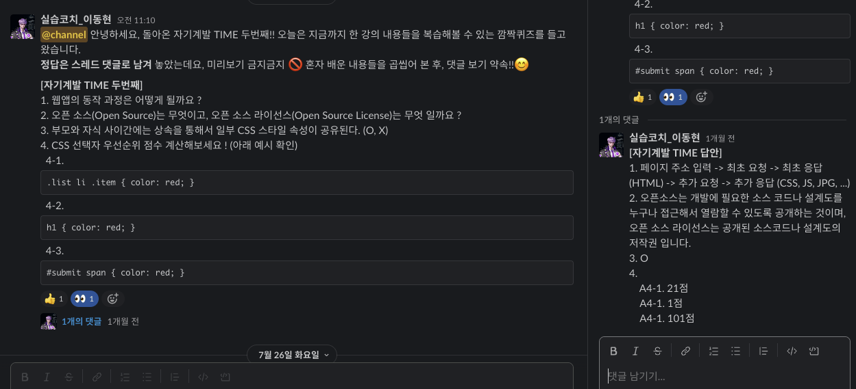 중간에 코치님이 퀴즈 내심..ㅋㅋㅋㅋ 다행히 정답도 주심..