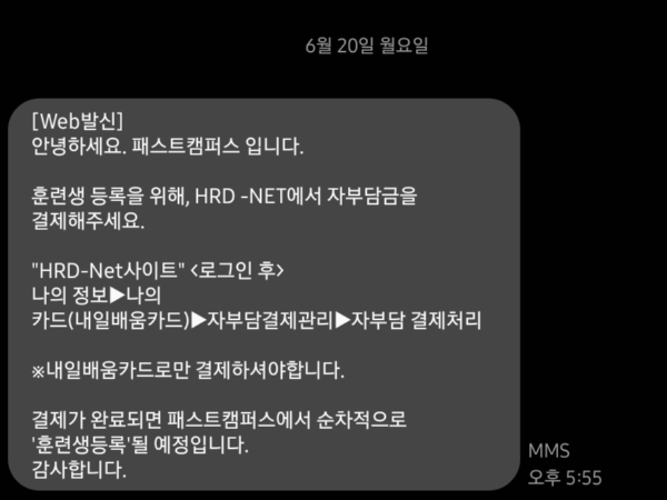 이 문자를 받고나서 hrd-net에 접속해서 자부담결제관리에 들어가서 공인인증서로그인을 한뒤에 결제를 하면됩니다.
