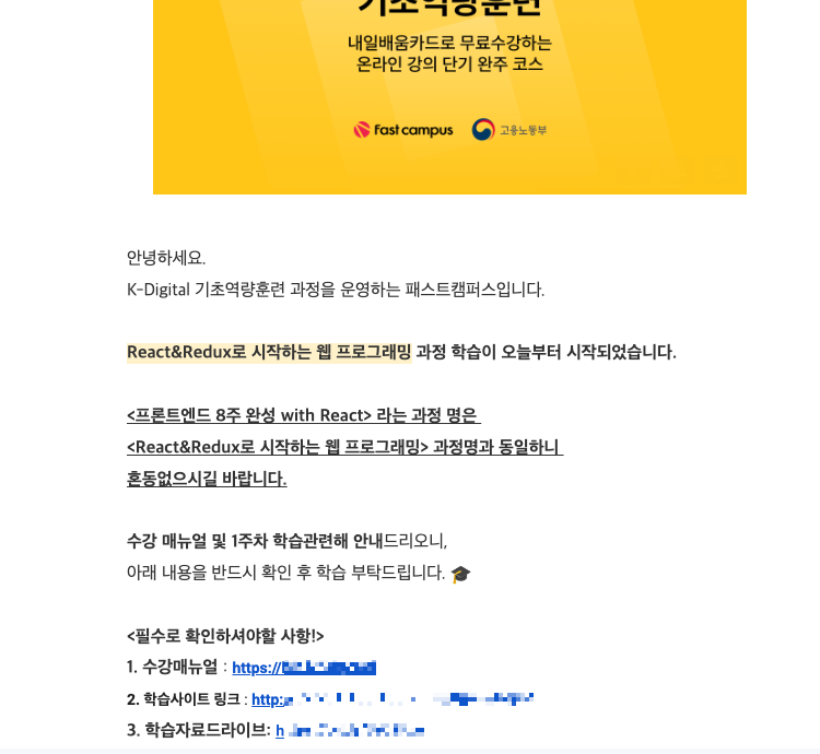 국비지원 패스트캠퍼스 React 프론트엔드 - 자부담 결제 후 수강확정 메세지